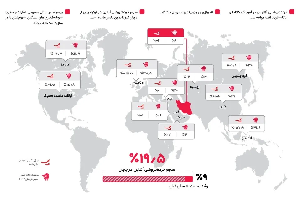 سهم ایران در تجارت الکترونیک از ۴ درصد در سال ۱۴۰۱ به ۶ درصد در سال ۱۴۰۲ افزایش یافته است. دیجیکالا به تنهایی یک چهارم از این سهم را در اختیار دارد. سایر فروشگاههای اینترنتی با نماد اعتماد الکترونیکی ۱.۵ درصد و تجارت الکترونیکی اجتماعی (فروش در شبکههای اجتماعی) نیز ۳ درصد از این سهم را به خود اختصاص دادهاند.