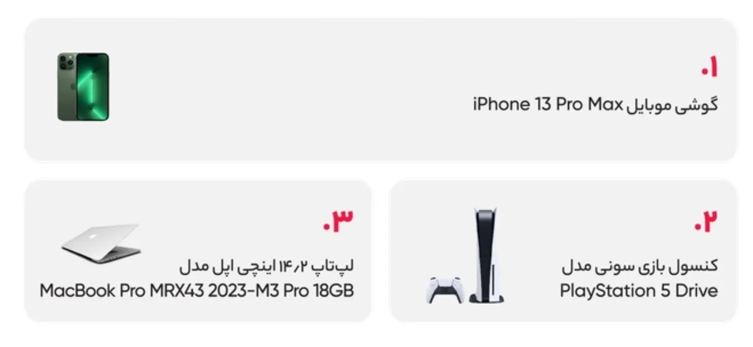 گرانترین کالاهایی که در سال ۱۴۰۲ بصورت قسطی از دیجی کالا خریداری شده اند عبارتند از: