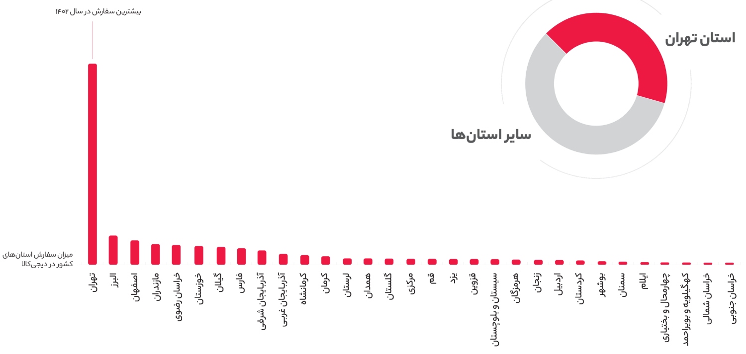بیشترین سفارش در سال ۱۴۰۲ از دیجی کالا از استان تهران و کمترین سفارش از استان خراسان جنوبی می باشد.