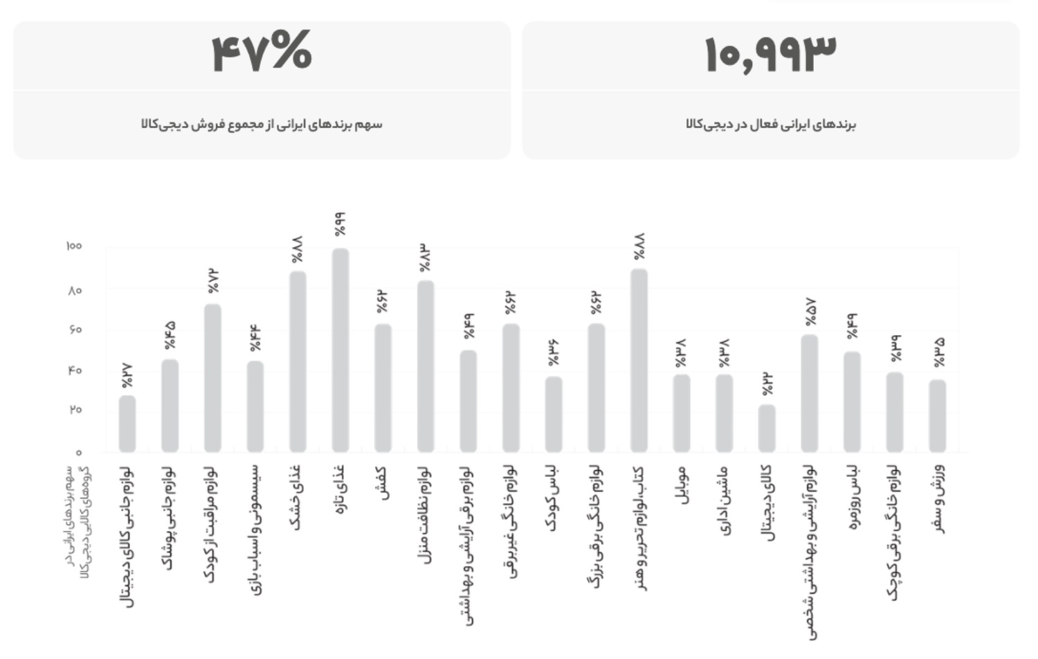 برای یک فروشگاه آنلاین مانند دیجی کالا، تنوع کالاها و برندهای موجود از لحاظ کمی و کیفی اهمیت زیادی دارد. در سال ۱۴۰۲، با ادامه ممنوعیت ورود کالاهای خارجی، برندهای ایرانی نقش پررنگتری در این پلتفرم ایفا کردند. میزان فروش برندهای معتبر در گروههایی مانند لوازم خانگی نشان داد که بسیاری از این برندها، دیجیکالا را بهعنوان یکی از مهمترین بسترهای فروش محصولات خود انتخاب کردهاند. این رشد و حضور پررنگ برندهای داخلی، نشاندهنده اهمیت دیجیکالا در بازار داخلی و توانایی آن در حمایت از تولیدات ملی است.