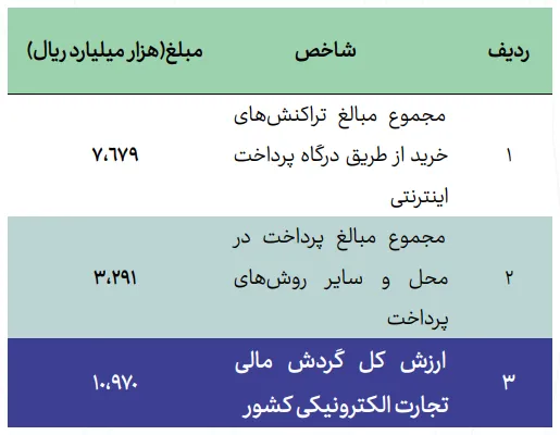 ارزش اسمی معاملات تجارت الکترونیکی 1097 هزار میلیارد تومان بوده که رشد 159 درصدی را نشان میدهد. ارزش حقیقی معاملات تجارت الکترونیک نیز 154 هزار میلیارد تومان بوده که نسبت به سال قبل 78 درصد رشد داشته است. به طور میانگین، مبلغ هر خرید الکترونیک 347 هزار تومان برآورد شده که 24 درصد بیشتر از سال قبل است.