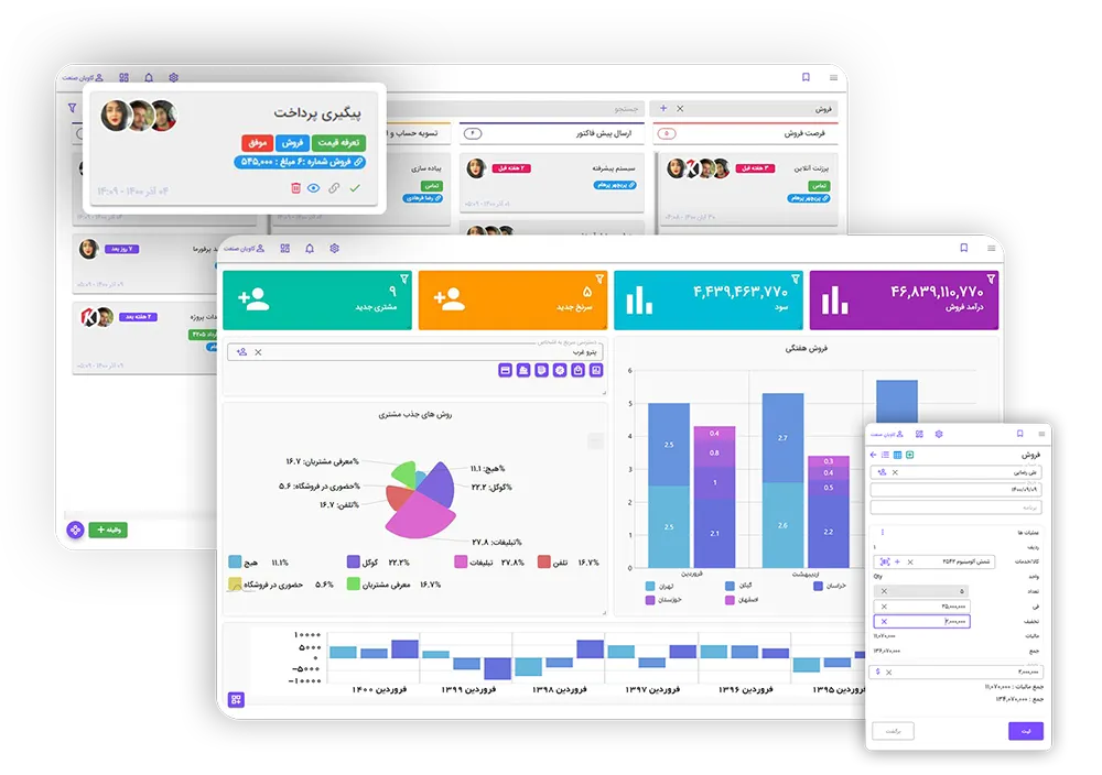 این مجموعه با ساده کردن فرایندهای تامین و فروش کالا و خدمات، همگامسازی کانالهای فروش آنلاین، شبکههای اجتماعی و حضوری و برقراری ارتباط همیشگی با مشتریان، همانند یک دستیار آنلاین بدون محدودیت مکان و زمان، باعث بهرهوری بیشتر از منابع و افزایش سود میشود.