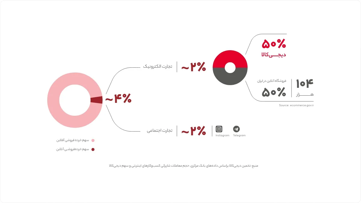 تخمین میزان سهم خردهفروشی آنلاین توسط بخش تحقیق و توسعه بازاریابی مالی مجموعه دیجیکالا انجام شده است. آمارهای مربوط به میزان سهم تجارت الکترونیک سایر کشورها هم از طریق دادههای STATATISTO حاصل شدهاند.