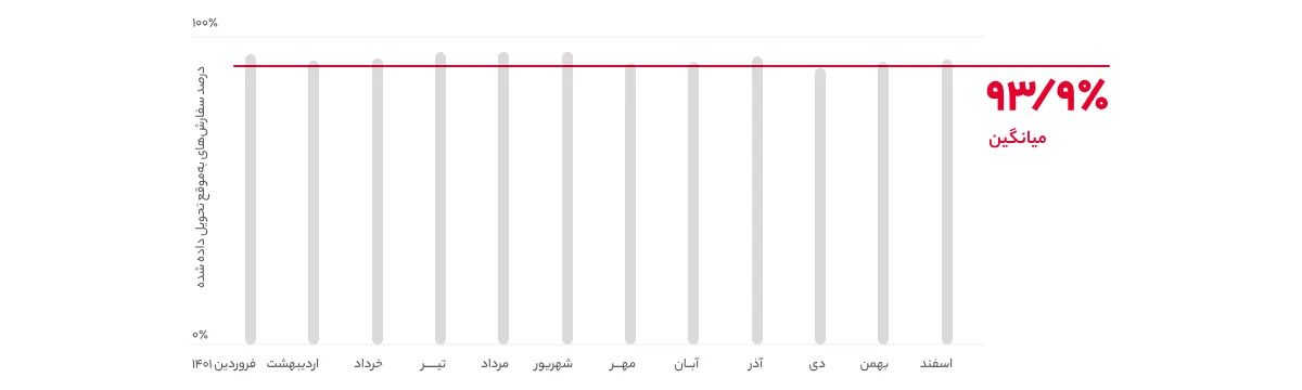 همانطور که میدانید تحویل بهموقع سفارشات یکی از شاخصهای بسیار مهم در جلب رضایت مشتریان محسوب میشود. در گزارش سال ۱۴۰۱ دیجی کالا آمده که این مجموعه توانسته حدود ۹۳.۹ درصد از سفارشات مشتریان را در موعد مقرر و بدون هیچگونه تاخیری به آنها تحویل دهد. حدود ۲.۱ درصد از سفارشها نیز با تاخیری چند ساعته در همان روز به دست خریداران رسیدهاند. در این بین ۴ درصد کالاها هم با تأخیر یک روزه یا بیشتر تحویل داده شدهاند.