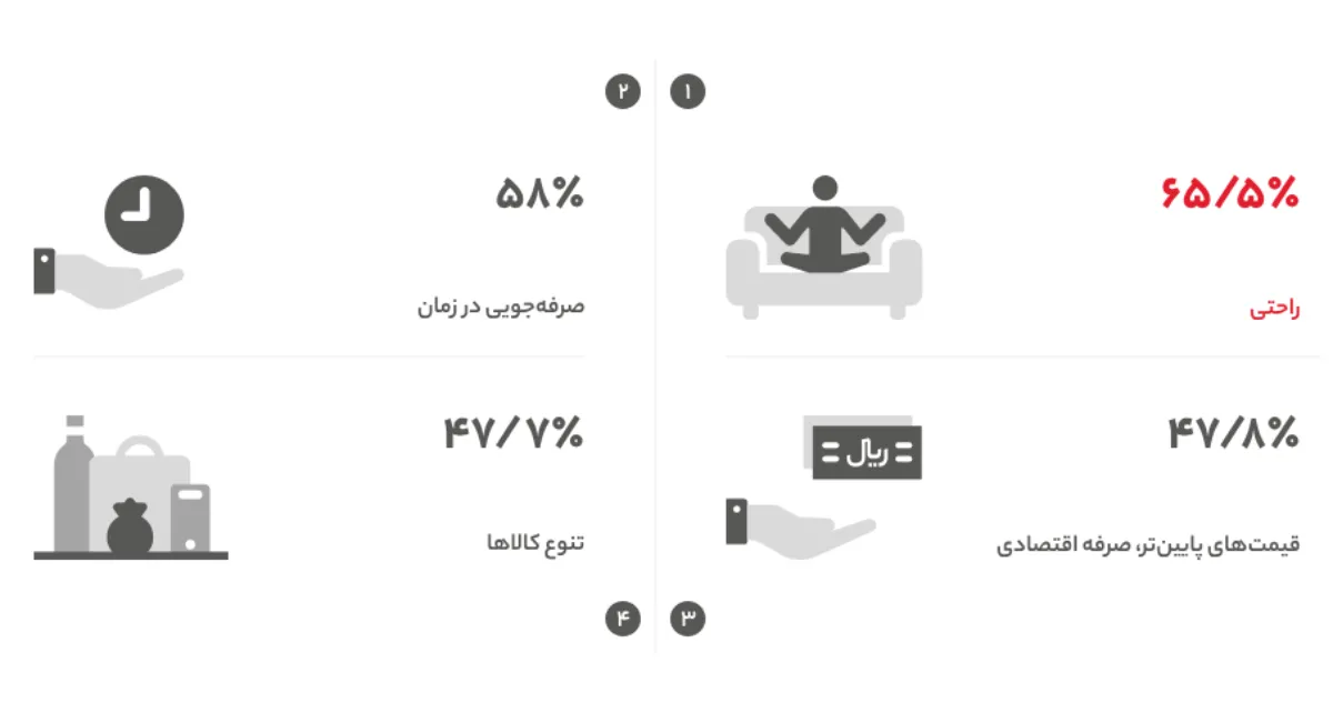 از بین گزینهها، راحتی، صرفهجویی در زمان، قیمتهای پایینتر و صرفه اقتصادی، و تنوع کالاها، 4 مزیت اصلی انتخابی پاسخگویان بوده است.
